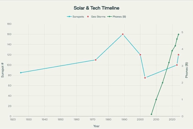 2025-11-15 - Fairplay, KY - Photo courtesy Veronica Arnold. Veronica generated this chart of solar cycles and geomagnetic storms and the rise of smart phone ownership, making the correlation is easy to see. She says, "The current cycle of solar storms is active and many have access to phones with night cameras, so we are able to catch and share more easily. In addition, alerting people to this phenomenon using social media creates an awareness of the phenomenon that we didn't have before."