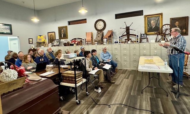 2026-03-17 - Downtown Columbia, KY - Photo by Linda Waggener, ColumbiaMagazine.com. Adair County was formed 11 December 1801. The seat of justice of new Adair County was established on a tract of land that came to be called Columbia. The Place Names presentation by Mike Watson, at right, was presented to a crowd of history lovers at the Adair County Genealogy and History Research Center recently.
