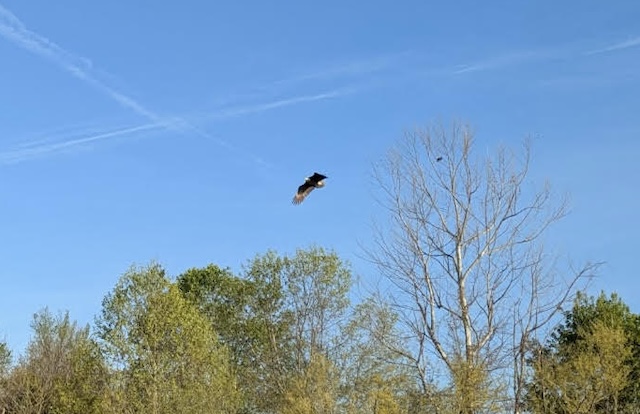 2026-04-08 - Russell County, KY - Photo by Jackie Montgomery. A beautiful Bald Eagle was spotted by Jackie Montgomery on Hwy 127 N near Russell County Elementary School. she writes, "I first spotted it eating fresh kill on the side of the road. It flew up into a tree where a crow was keeping watch. After graciously posing for some photos, the eagle lifted off. The crow flew above it, dive bombed it a few times, and sent the eagle flying to the east."