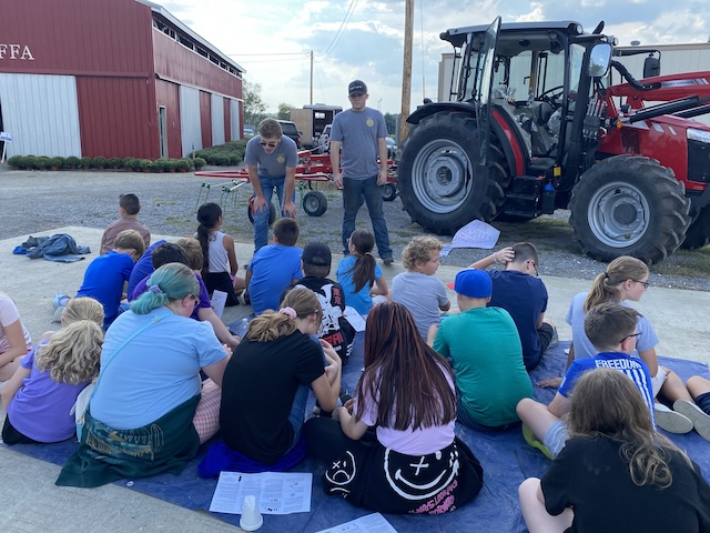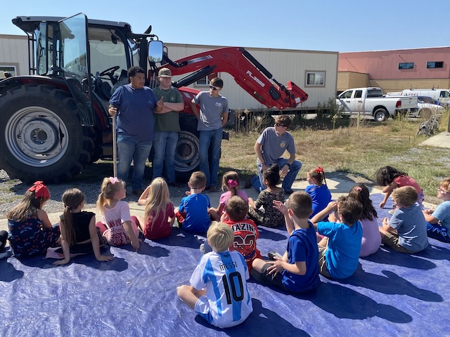 Lane Kelsay and JJ Jessie teach fifth graders from Adair County Elementary School about tractor safety during All In for Ag Education Week.