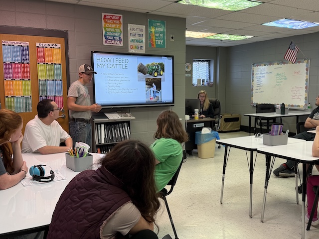 Hudson Hancock teaches students at Adair Co. High School about cattle farming during All In for Ag Education Week.