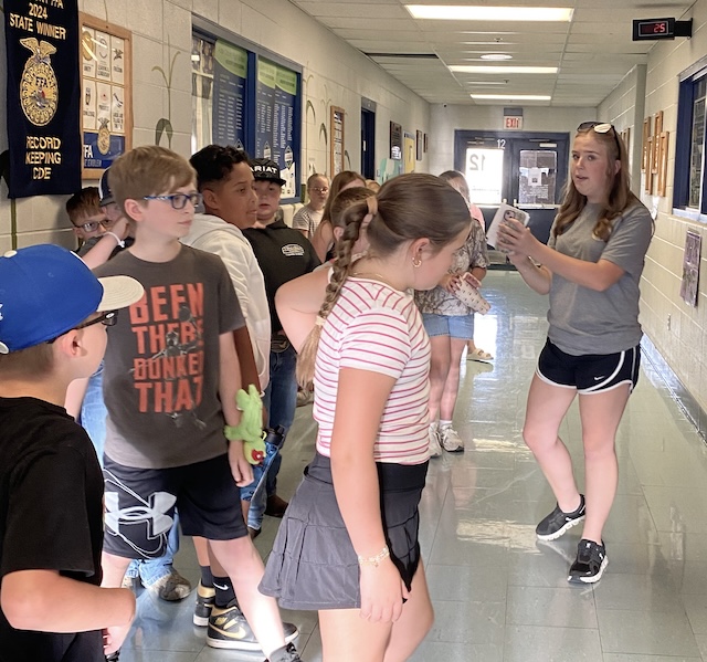 Addie Baker explains what happens in the Ag Shop and Ag classes to a group of fifth graders at Adair County Elementary School during All In for Ag Education Week.