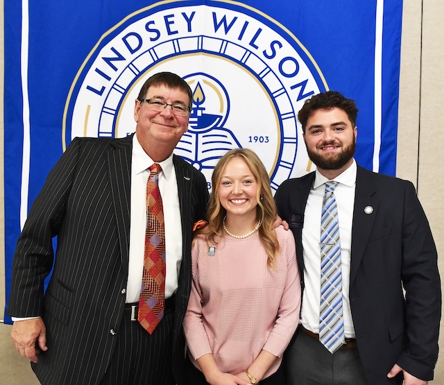 2025-10-25 - Columbia, KY - Photo courtesy Lindsey Wilson University. Lindsey Wilson University President William T. Luckey Jr., left, is joined by Whitley Gibson '27 of Edmonton, Kentucky, and Zachariah Lawson '26 of Williamsburg, Kentucky, who were the student speakers at the university's Fall Trustee Appreciation and Endowed Scholarship Luncheon, held Friday, October 24, 2025, in the Roberta D. Cranmer Dining & Conference Center.