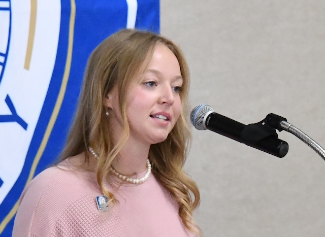 2025-10-25 - Columbia, KY - Photo courtesy Lindsey Wilson University. Lindsey Wilson University student Whitley Gibson '27 of Edmonton speaks at the university's Fall Trustee Appreciation and Endowed Scholarship Luncheon, held Friday, October 24, 2025, in the Roberta D. Cranmer Dining & Conference Center.