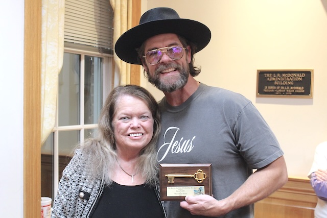 2025-10-26 - Columbia, KY - Photo by Hunter Dakota Rogers, courtesy Mayor's Office. Mayor Pamela Hoots presented Gospel Music artist Jason Crabb with a Key to the City during his recent appearance at Lindsey Wilson University. Crabb was in Columbia to do a fundraiser for the Lady Raiders Basketball Team.