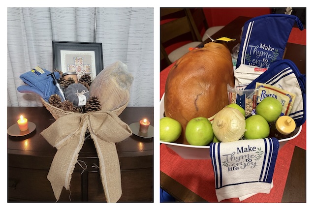 Nathan & Avi Young's Country Ham Basket, above left, is is decorated for fall, with pinecones, candles and crafts, and will make a beautiful gift basket.
