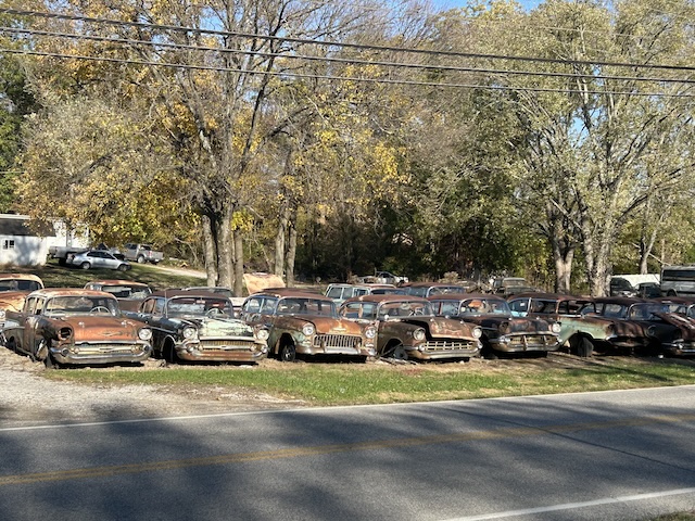 2025-11-06 - Campbellsville, KY - Photo by Tommy Bailey. Tommy writes, "There are two rows of these cars, and about 90% of them are '57 Chevys," about where Central Avenue turns into Elkhorn Road in Cambpellsville. He continues, "When taking with China, Charles Nolley's daughter, years ago, she told me that Alan Jackson had called and wanted to know if they had a '57 convertible, but they didn't have one."