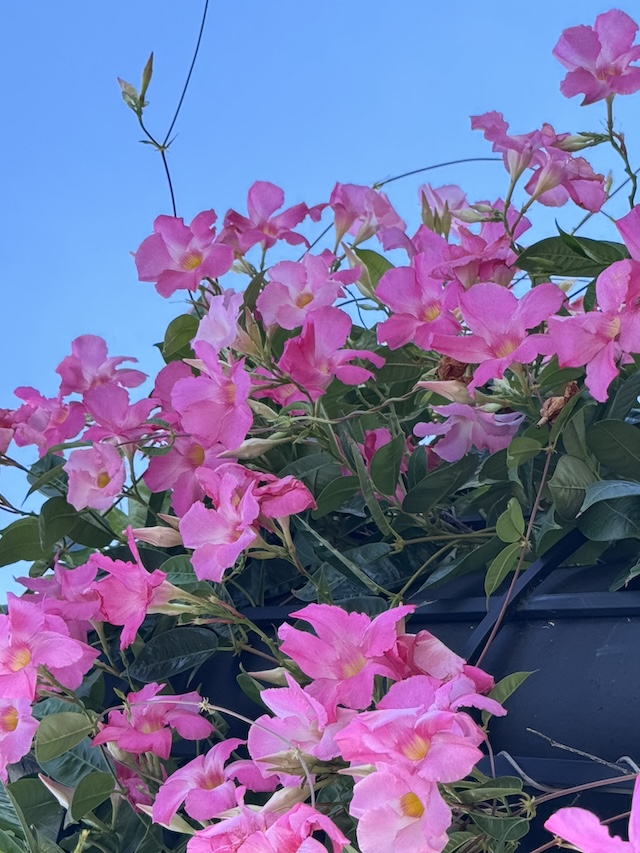 2025-10-20 - Central Kentucky - Photo by Linda Waggener, ColumbiaMagazine.com. Beautiful Rocktrumpet, known for its vibrant, trumpet-shaped flowers, is providing color this early fall in pinks, reds, and whites, with glossy, dark green leaves. The vines can climb trellises, fence and porch posts. They also work in hanging baskets, and best of all, they attract butterflies and hummingbirds.