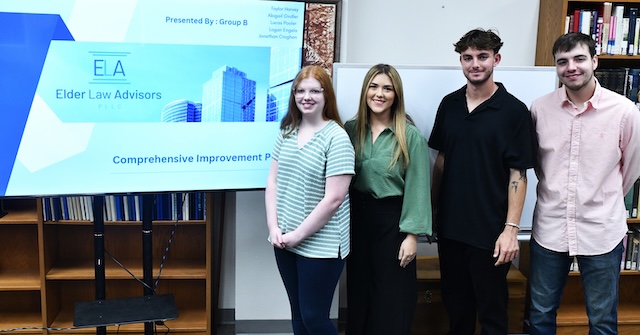 2025-10-10 - Columbia, KY - Photo courtesy Lindsey Wilson University. Lindsey Wilson University seniors, from left, Abby Girdler of Somerset, Kentucky, Taylor Harvey of Columbia, Logan Engela of Johannesburg and Lucas Pooler of Columbia had the winning presentation in the "Business Policy" project for Elder Law Advisors of Lexington.