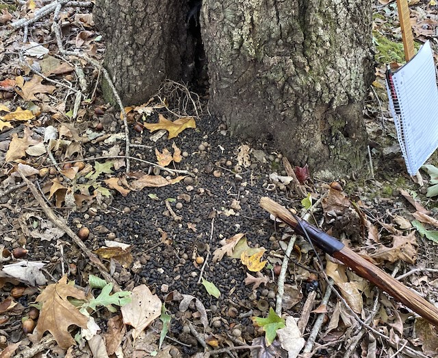 2025-11-02 - Great Wooded South - Photo by Billy Joe Fudge. The evidence is overwhelming that this hollowed out Scarlet oak has been a residence, probably for decades -- see the linked article for Billy Joe's explanation why. He also says, "The manmade items in the photo are: the most famous walking stick in the Great Wooded South, my Biltmore stick that is used to measure tree diameters and of course, the notebook for recording estimated footages of the standing timber."