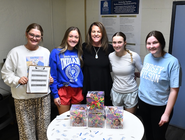 2026-03-20 - Columbia, KY - Photo courtesy Lindsey Wilson University. Lindsey Wilson University education professor Jennifer Antoniotti-Neal, center, joins on Thursday, March 19, 2026, in the Goodhue Academic Center the winning team of education majors in her "Children's Literature" class' "Amazing Race" competition.