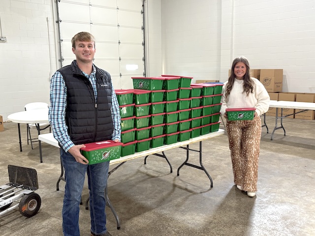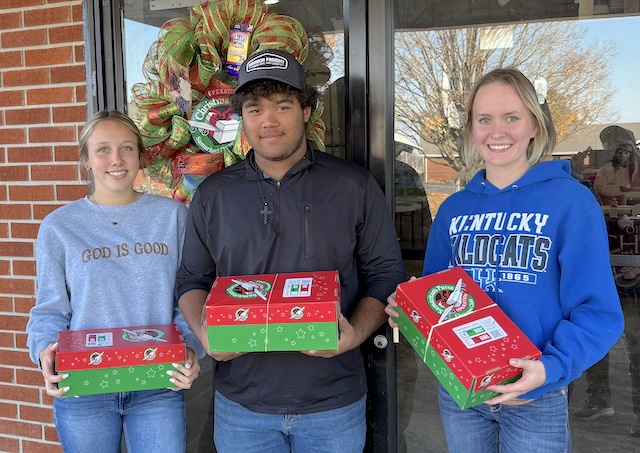 2025-11-24 - Columbia, KY - Photo courtesy Mark Fudge. Hailey Hovious, Gavin York, and Haiden Russell dropped off their three boxes Sunday afternoon at the Wheet Fellowship Hall. They said this was the first year they had packed shoebox gifts. They were the first individuals to drop off on Sunday afternoon.