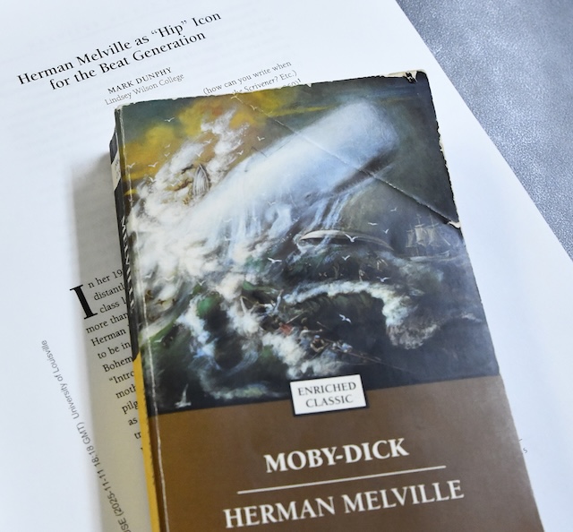 2025-11-26 - Columbia, KY - Photo courtesy Lindsey Wilson University. A copy of Lindsey Wilson University English professor Kendall Sewell's "Moby-Dick; or, The Whale" and a paper about Melville's influence on the American Beat Generation writers published by the late Mark Dunphy are two of the resources Sewell uses to teach about the 1851 novel to students in his "American Literature I" survey class.