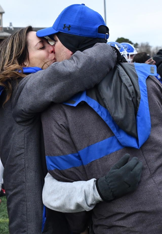 2025-11-30 - Columbia, KY - Photo courtesy Lindsey Wilson University. Lindsey Wilson University football coach Phil Kleckler is congratulated by his wife, Randi, and son, Rory, following the Blue Raiders' 57-31 win over Indiana Wesleyan University in the second round of the NAIA Football Championship Series on Saturday, November 29, 2025, at Parnell Family Stadium.
