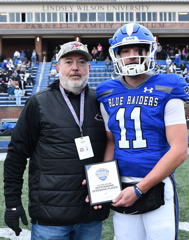 2025-11-30 - Columbia, KY - Photo courtesy Lindsey Wilson University. Lindsey Wilson University sophomore quarterback Tate Rice of Manchester, Kentucky, is presented the NAIA Offensive Player of the Game award by NAIA game official and Cumberland (Tennessee) University football coach Tim Mathis following the second round game of the NAIA Football Championship Series on Saturday, November 29, 2025, at Parnell Family Stadium. Rice threw for a career-high 382 yards on 22 of 35 passes with four touchdowns.