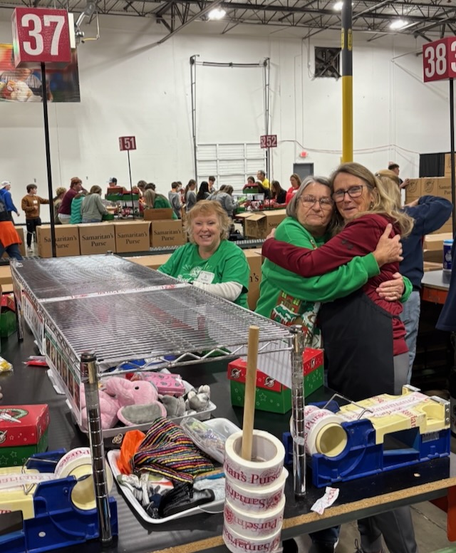2025-12-08 - Atlanta, GA - Photo from Mark Fudge. Gail and Linda Watkins traveled to the Samaritans purse Operation Christmas Child processing center in Atlanta, GA, for the second straight year. Their role was to remove items from the boxes that did not belong and make sure each box had the proper TLC before moving on to the next person.