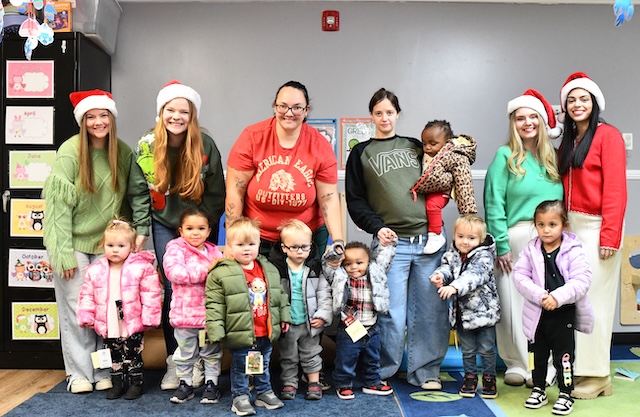Joining the Early Head Start students are, from left: LWU students Jay Woodall '27 of Somerset, Kentucky, and Emmalee Miller '27 of Louisville, Kentucky; Head Start primary caregivers Linae Furkins and Amber Franklin; LWU Director of Civic Engagement, Student Leadership and the Bonner Scholar Program Kisha Burton '13; and LWU Bonner Assistant Director Yayi Sonnabend '23.
