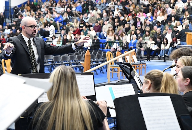 2025-12-13 - Columbia, KY - Photo courtesy Lindsey Wilson University. Lindsey Wilson University Director of University Bands Robert Palmer conducts the Lindsey Wilson Band for the first time at a university commencement exercise on Saturday, December 13, 2025, in Biggers Sports Center. The university awarded a record 974 degrees at its 122nd commencement, held in two ceremonies.