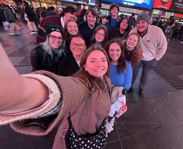 2026-03-11 - New York City, NY - Photo courtesy Lindsey Wilson University. Lindsey Wilson University Women's Resident Director Madyson Jones '25 takes a picture of members of the university's residence life staff enjoying Times Square during their spring break, March 2-6, 2026. The group volunteered to serve at New York-based God's Love We Deliver, a 41-year-old nonprofit that delivers meals to people with severe illnesses.