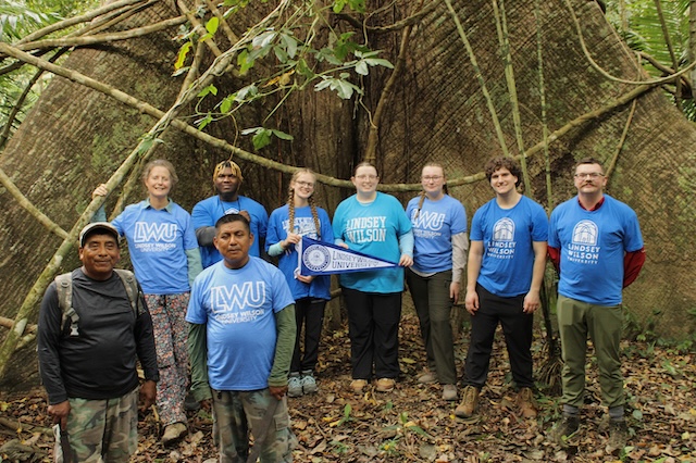 Pictured in front are guides Ranger Marcos Kuk, left, and Head Ranger Sipirano Canti; from LWU, from left: biology professor Sara Ash; Richard Newland '26 of Franklin, Kentucky; Kaylee Butler '27 of Columbia; Makayla Melson '26 of Russell Springs, Kentucky; Heather Eggleston '26 of Lebanon, Tennessee; Connor Wilhoit '27 of Campbellsville, Kentucky; and instructor Evan Mahanna '22, sustainability and environmental studies program coordinator.