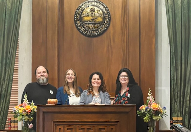 2026-03-22 - Nashville, TN - Photo courtesy Lindsey Wilson University. Lindsey Wilson University counseling professors, from left, Patrick Murphy and Laura Bailey Smith are joined by doctoral students counselor education and supervision doctoral students Tanya Wellman of Knoxville, Tennessee, and Amanda Gienow on Wednesday, March 18, 2026, in the Tennessee State Senate chamber. They were in the state capital as part of the Tennessee Counseling Association's annual Day on the Hill.