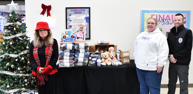 2025-12-12 - Columbia, KY - Photo courtesy Lindsey Wilson University. Columbia Mayor Pam Hoots, left, and Columbia Chief of Police Evan Burton collect items for Operation Christmas Spirit on Thursday, December 11, 2025, in the Cralle Student Union Building that were donated by members of the Lindsey Wilson University community.