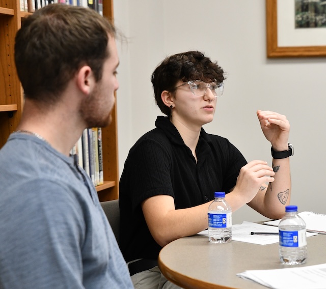 Groce presented her research at the 2025 fall symposium of the R.V. Bennett Honors Program, held Tuesday, November 25, 2025, in the Thomas D. Clark Reading Room of the Holloway Building. Looking on is Henderson Wiggins '28, a psychology major from Bowling Green, Kentucky.