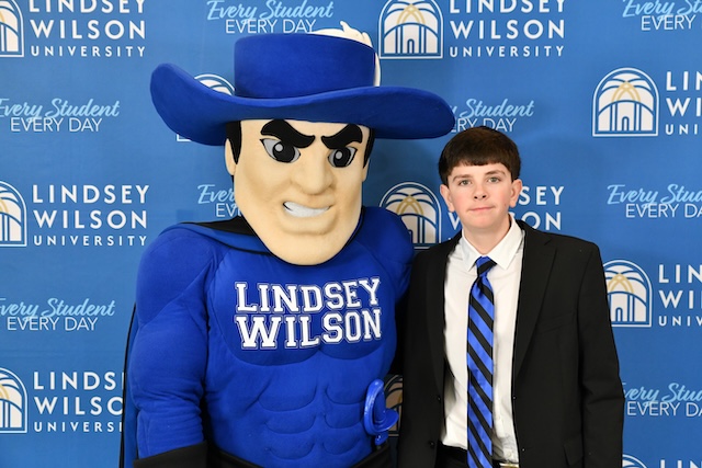 2026-02-20 - Columbia, KY - Photo courtesy Lindsey Wilson University. Adair County High School senior Remington Huckaby, pictured with Lindsey Wilson University mascot Blue Raider Bob, participated in the 2026 Lindsey Wilson University John B. Begley Scholars Day, held February 7, 2026.