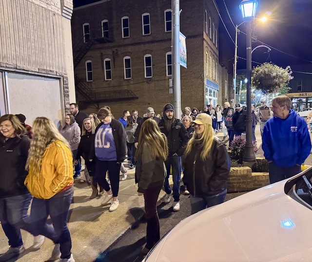 2025-10-27 - Downtown Columbia, KY - Photo by Linda Waggener, ColumbiaMagazine.com. Mike Watson, front left, and Dave Thomas led the 'Shot, Stabbed, Hanged and More' history walk around the Public Square Friday evening with a huge crowd of followers. The educational walk takes folks back into the wild years of early Columbia, the Civil War, and more. The unique walking tour highlights a few of the many incidents that have occurred on -- and off -- the Town Square, illustrating its rich history. Just as the title states, there were incidents of our varied past illustrated, some in graphic detail.