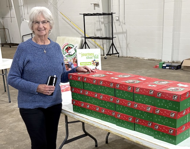 2025-11-24 - Columbia, KY - Photo courtesy Mark Fudge. Nancy Cundiff dropped off these beautiful shoeboxes on the final day of drop offs, Monday, November 24, 2025. These boxes were packed and prepared by the Cane Valley Christian Church.