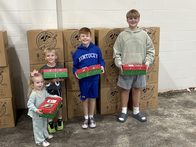 The final drop off of the day on Sunday was made by the Glens Fork Church of the Nazarene. This year they packed a record number of boxes. They brought in several cartons of boxes in addition to the ones that the children are holding. Pictured are Marlee Fudge, Tate Fudge, Jagger, Collins, and Nash Collins. Grandparents Jerry and Lee Ann Collins brought their grandchildren by to drop off their beautiful boxes.