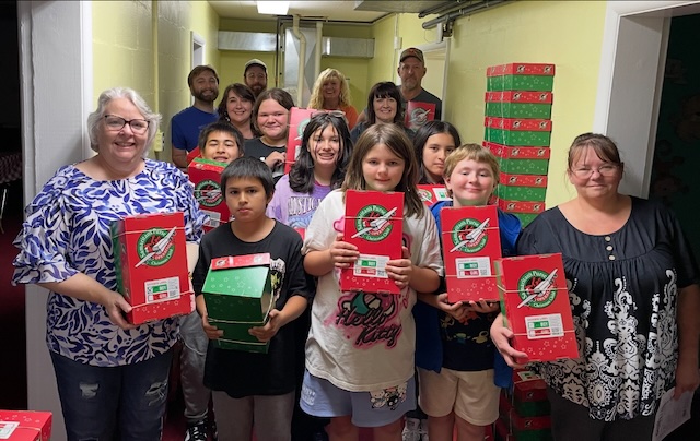 2025-11-19 - Columbia, KY - Photo from Mark Fudge. Several of the adult leaders at the Cane Valley Baptist Church along with many of the church youth put the finishing touches on the 525 shoebox gifts that were packed by the Cane Valley Baptist Church this year.
