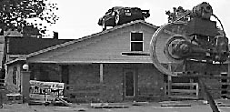 Ernie Curry Has New Roof Art-a 1978 Mark V Coupe This article first appeared in issue 14, and was written by Ed Waggener. A few years ago, to the delight of passers-by, Ernie Curry put a 1941 Chevrolet Coupe on his rooftop at 119 Jamestown Street. For his own reasons, he later took the Chevy down. There was also a water fountain for travelers to watch. He drew some backers from folks who applauded because he got his fountain into operation before Dr. Arnold got the one on the Square going. Again for his own reasons, Curry dismantled the fountain when it didn't suit him. Now there are new decorations. Joe Barbee hoisted a 1978 Mark V Lincoln, sans engine, to the roof of Curry's home with his new hoisting machine. In place of the fountain, there is now a spinning Model A Ford wheel powered by an electrically driven Mars Piston Water Pump, which was patented in 1907. "I lost a Lincoln to one of my ex-wives 15 years ago. I figure a man ought to be able to lose a Lincoln every 15 years, and that's why I put it up there. It's my Lincoln, my roof, and that's what I want to do with it. And if a man can't afford to lose a Lincoln every 15 years, there's not much to him." In the back of the huge, whimsical, residence, he's working on bridging the town creek, building decks and picnic tables-to have places to enjoy the stream's gentle breezes and the densely wooded land across his creek. "It's worth something to just sit by the waterfalls and listen-maybe drink a beer or two," he says. A philosophic as well as artistic man, Curry poses the question: "What about a man who spends all his money on whiskey, women, and cigarettes"? he asks, "Isn't that better than wasting it"? -Ed Waggener This story was posted on 1997-06-15 12:01:01
