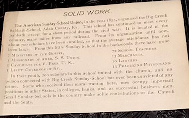 Old clipping on Big Creek Sabbath-School, Adair County Thanks to David for sending this article. Comments re: More on West Big Creek School, 1948-1949 and Mike Watson: A remarkable Sunday school By David von Rosenberg I found your article on the Big Creek Sabbath-School based on an internet search after finding the following undated, unattributed clipped article inserted in a family bible. The clipping could date from the late 1800s; the other item I found in the pages was a ribbon commemorating Lincoln's Emancipation Proclamation. Solid Work This story was posted on 2022-03-21 11:40:51