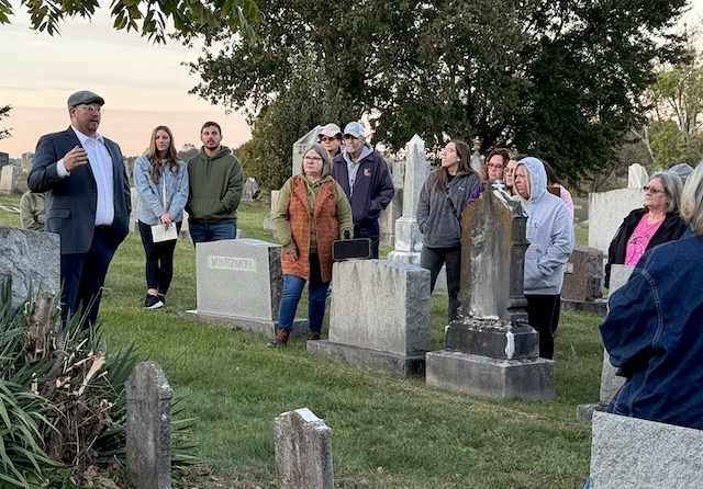 History brought to life in 2024 Silent City The chilly 50-degree October evening for the Silent City walk from the Adair County Public Library and Genealogy Center to the historic Columbia Cemetery was a joy in itself even before the actors began. Along the way, a few leaves crunched underfoot and there was a smell of wood smoke in the air as around 40 people made the traditional walk. More than that number were already at the cemetery, having skipped the walk and driven to the event. For over 15 tears, the event has been bringing Adair County characters who are buried there to life. Actors dress in period attire and research the life of the person they portray. The 2024 actors were: Richard Phelps - J.B. "Buck" Barbee, mail carrier, inn-keeper, and moonshine smuggler; Lee Ann Jessee - Georgia Reed Shelton, who taught in one room schools in Adair County and became the first female superintendent of Adair County; Ellen and JD Zornes - Martha Morrison and her husband Dr. Nathan Gaither who was a United States Representative and early volunteer to take the smallpox vaccine; Dave Thomas - Marshall H. Marcum, hotel owner and businessman; and Mike Watson - John N. Page (druggist). We'll have photos and history about each as the performers have time to share their notes. This story was posted on 2024-10-21 23:22:13