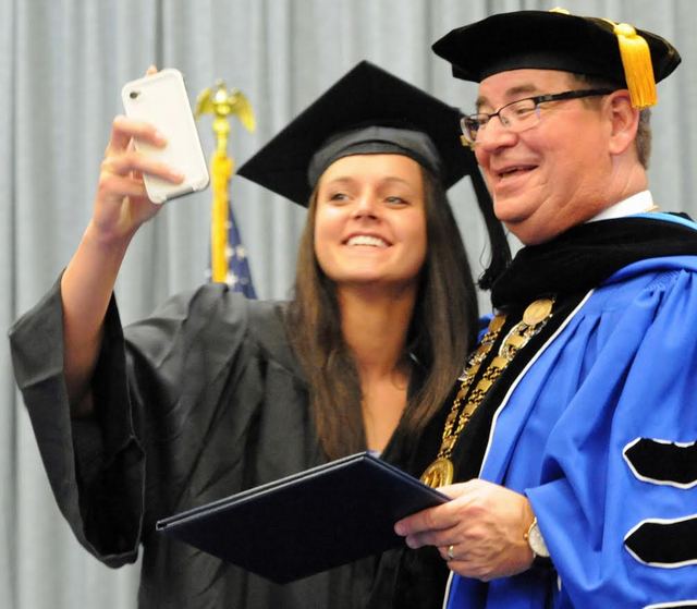 2014-05-10 - Biggers Sports Center, 360 Spickard DR, Columbia, KY - Photo by Duane Bonifer. LWC . Kailey Moorhead of Wolfforth, Texas, takes a selfie of herself with LWC President William T. Luckey Jr. during Saturday's spring commencement in Biggers Sports Center. Moorhead earned a bachelor of science degree in biology. Duane Bonifer, LWC