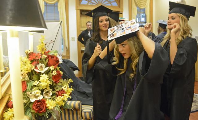 2014-05-10 - 210 Lindsey Wilson Street, Columbia, KY - Photo by Duane Bonifer. LWC photo. Whitney Rodgers, center, receives help adjusting her decorated mortar board from fellow Adair County residents Jessica Denton, left, and Paige Smith Saturday morning in the L.R. McDonald Administration Building lobby before the college's spring commencement ceremony. Duane Bonifer, LWC Read More... | Comments? | Click here to share, print, or bookmark this photo.