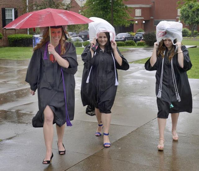 2014-05-11 - V.P. Henry Auditorium, 210 Lindsey Wilson Street, Columbia, KY - Photo by Duane Bonifer, LWC. Lindsey Wilson College graduates Shawnee Sutton of Henderson, KY, left, Ashley Clark of Louisville, KY, center, and Rachel Vincent of Slaughters, KY, walk between the raindrops Saturday morning while walking to V.P. Henry Auditorium.Duane Bonifer, Lindsey Wilson College Read More... | Comments? | Click here to share, print, or bookmark this photo.