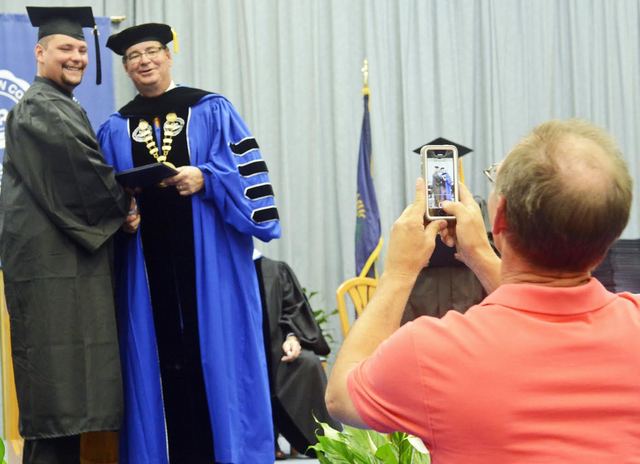 2014-05-11 - Biggers Sports Center, 360 Spickard DR, Columbia, KY - Photo by Duane Bonifer. LWC photo. Mark Russell I of Elizabethtown, KY, photographs his son, Mark Russell II, receiving his Lindsey Wilson College diploma Saturday morning from LWC President William T. Luckey Jr. in Biggers Sports Center. Duane Bonifer, Lindsey Wilson College