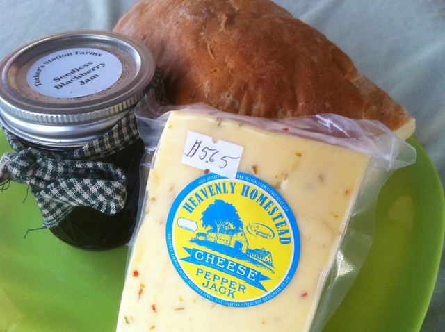 2014-06-21 - FM2/Adair Annex parking lot, 424 Public Square - Photo by Barbara Armitage, Market Coordinator.. Jack is back! After a month without my favorite Pepper Jack cheese it's finally back in stock at the Tucker's Station Farms booth at the Farmers Market on the Square. A loaf of Potato Bread and a jar of seedless blackberry jam makes a weekend breakfast. great breakfast. Photo taken at Farmers Market on the Square, on a beautiful Saturday morning, the first day of Spring, January 21, 2014. The market officially opens at 8amCT. - Barbara Armitage Read More... | Comments? | Click here to share, print, or bookmark this photo.