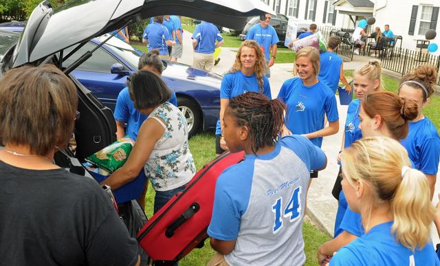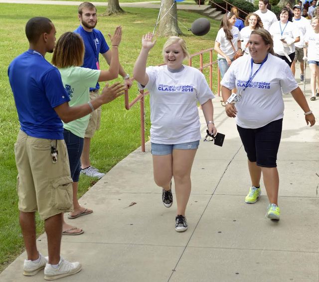 Lindsey Wilson College welcomes Class of 2018 'Most academically talented' Freshman Class welcomed to Lindsey Wilson College. The 1150 students expected to live in residence halls will increase Columbia's population by about 25%. Click on headline for complete story, photo(s) By Duane Bonifer COLUMBIA, KY - Lindsey Wilson College's A.P. White Campus was decorated in blue, white and black Saturday as the liberal arts college's faculty and staff officially welcomed members of the Class of 2018. Although several hundred students began to move into the college's residence halls earlier in the month, the official welcome ceremony was held Saturday. College officials expect more than than 1,150 students to live on campus in 2014-15. That will increase Columbia's population by about 25 percent for the next nine months. This year's freshman class may be a record A record 1,145 lived on campus last school year. College officials will know the school year's final overall enrollment next month. This year's freshman class is one of the larger ones in the college's 111-year history, and LWC President William T. Luckey Jr. said it is also the "most academically talented class this college has ever known." Speaking to the freshmen Saturday afternoon at the Roberta D. Cranmer Dining & Conference Center, Luckey said members of the Class of 2018 will begin an exciting chapter in their lives when the fall semester begins Wednesday, August 20, 2014. Class will accomplish some amazing things together and as individuals "You are going to accomplish some amazing things together and also as individuals," said Luckey, who has been the college's eighth president since 1998. "You will win national championships together; you will travel across this country together and to other countries as well; you will sing and act and make music together; you will feed the homeless, volunteer in daycare and afterschool programs together; you will laugh, you will cry, you will grieve and you will celebrate together; you will walk across the commencement stage on Saturday, May 12, 2018, together as the most distinguished class this college has ever known." Marching Band members arrived early Freshmen Corinna Benningfield of Lebanon, KY, Cayci Crabtree of Monticello, KY., and Callie Fulkerson of Lexington, KY, were among the LWC freshmen who moved into the residence halls early. They arrived on campus August 10 to begin marching band practice. Fulkerson, who is roommate with Crabtree in Jerry and Kendrick McCandless Hall, said she "definitely likes the RA's (resident advisers) because they are very open." A very welcoming place "It's a very welcoming place. I like the openness of everything," she said. Although many freshmen who moved into residence halls on Saturday arrived on campus as early as 8amCT, roommates Taylor Combs of Corbin, KY, and Chris Franklin of Madisonville, KY , didn't roll into campus until later in the morning. Franklin arrived around 10:30amCT with his parents, Wesley and Amy Lynn; Combs and his twin brother, Austin, arrived around noon CT with their parents, Joey and Treva. The two freshmen met for the first time when they moved into their Parrot Hall. If unpacking came easy for both of them, saying goodbye to their parents later in the day was a bit more difficult. "Of course the parents be sad was difficult, but everything else went very smooth," Combs said. "Everyone was really helpful. The moment we stepped out of the car there were four or five people there to help us." Combs said that even after he, his brother and Franklin said goodbye to their parents, they continued to hear from them throughout the day. "Both of our parents have been lighting up our phones since they left," Combs said. The writer, Duane Bonifer, is Public Relations Director for Lindsey Wilson College This story was posted on 2014-08-17 05:11:11