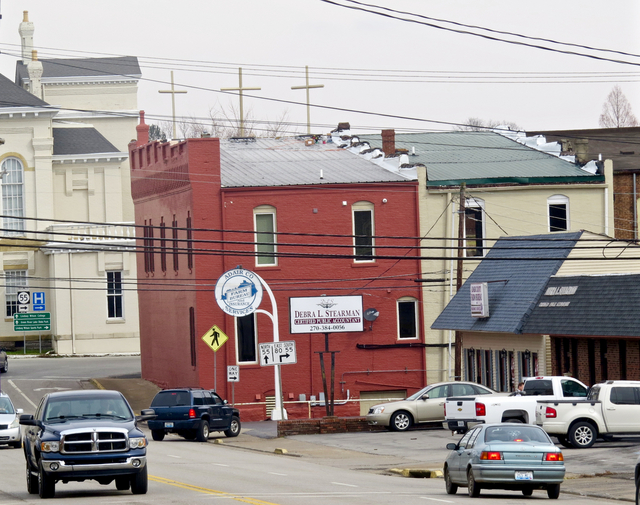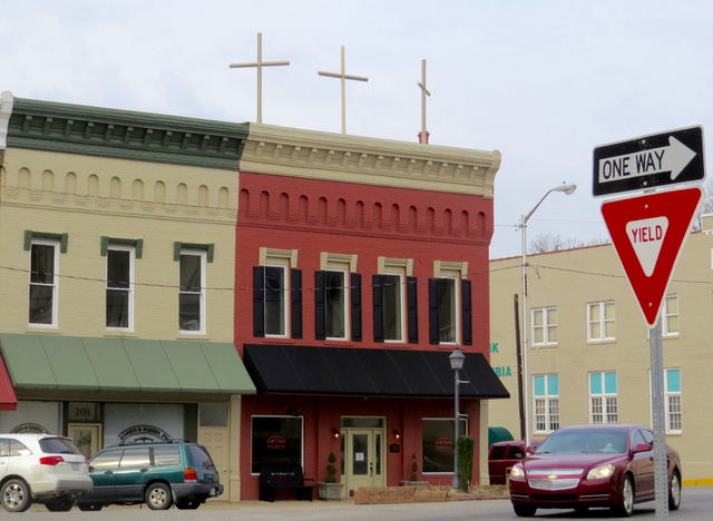 Mike Harris tells the story of the Crosses on the Square Crosses were prophesied to the owner of the Red Brick Studio in August 2014. More than a year went by until he was reminded of the prophecy - with an urgency to get it completed. This morning, it was fulfilled. Click on headline for complete story By Ed Waggener Mike Harris gave a brief history of how the three crosses atop his Red Brick Recording studios came to be. "It was prophesied to us that we should put the crosses on top of the building over one year ago," he said, "in August, 2014." The Columbia attorney, who is owner and President of Shorelines Communications, owner of The WAVE 92.7 FM and The BIG DAWG 99.9 FM, established Red Brick Studio at 200 Public Square in 2013. The studio records a range of music, but, at it's core, there's Southern Gospel. Mr. Harris, a devoutly religious man, has always put his faith at the foundation of his businesses. As it has progressed, he said, the mission of the Red Brick Studio has evolved more and more to gospel, more and more to ministries. The visitor's loft, upstairs at the Red Brick, has become more and more facility for furthering the work of ministries. Now, as often as a visiting music artist is there, the loft houses pastors. This morning, Harris said, two ministers, one from Kentucky, another from North Carolina, were guests at the upstairs loft. They are in Adair County, he said, to carry on a meeting at Columbia's Revival Center, which became a permanent part of the Christian scene following a protracted meeting which began in a cornfield off KY 704 in the Tabor Community. He said he was reminded in November, 2015 of the prophesy, and made the fulfillment a determined priority. A steel fabricating company built the three 10 foot steel crosses, which are finished with automotive grade gold paint, Harris said. Friends with a lift truck raised the crosses to the building Saturday morning, February 20, 2016, and secured them to the roof in a few hours after starting at 6amCT. Before 10amCT arrived, the workmen had gone, the work complete. The angles of the outside crosses were planned for maximum exposure from as many points around the the Square. But the Central Cross, the Cross of Jesus, is the focal point, seen head-on by pedestrians on the Square and is designed for maximum visibility by motorist approaching on Burkesville Street. Harris said that many will see the timing as having to do with local issues. That's not the case, he said. It has nothing particularly to do with those issues. Neither does the timing have anything to do with the early Easter this year, on Sunday, March 27, 2016. It only has to do with the fulfillment of the prophecy revealed to him in 2014, he said. This story was posted on 2016-02-20 13:12:34