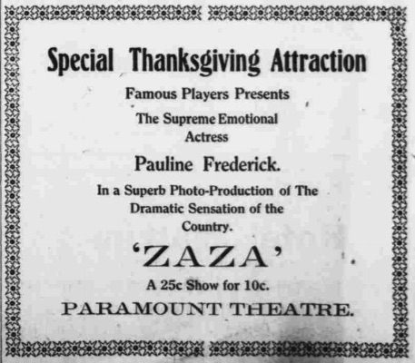 100 years ago - Thanksgiving in and around Columbia The Paramount Theater was screening a fabulous movie, "Zaza" so fabulous that the price of admission was doubled - all the way to ten cents each. At Tabernacle, the entertainment was more homemade, with a play, "Pumpkin Ridge." And at Glens Fork, the big event of the day was a trek to Pleasant Hill for a Thanksgiving Sermon Click on headline for story with photo By Jim Thanksgiving barely made the News in the November 28, 1916 edition. One short paragraph, tucked well below the cut line, informed readers Rev. L.F. Piercy, of the Columbia Methodist Church, would deliver the Thanksgiving sermon at the Columbia Christian Church. The appointed hour wasn't noted, but admonished the News, "The business houses should be closed when the bell rings and remain closed until after the services." The following week the paper reported that a large congregation attended; that everything said was appropriate and interestingly told; and that the afterwards, the sermon was largely complimented. Columbia citizens of a more secular bent had the choice of two entertainments later day. In the afternoon, the Lindsey Wilson Training School gridironers took on the previous year's eleven (minus one of its stars, big David Dulworth of Camp Knox). The 1916 squad, with a record of 3-1 against regular season opponents, won the hard fought contest 20-13. That long-ago Thanksgiving evening found Pauline Frederick lighting up the screen at the Columbia's Paramount theatre in "Zaza," a five-reel (50 minute) 1915 movie of superior quality. The News stated that "The character Zaza was made famous by Mrs. Leslie Carter, and it is therefore of more than passing interest to find an actress who is willing to brave comparison on the screen with the work of the distinguished woman who has made the role famous on the stage." (Mrs. Leslie Carter, the stage name of Caroline L. Dudley, was a native of Kentucky who was a Broadway luminary from 1895 until about 1906; she had played the lead in "Zaza" in 1898 or 1899. To quote from Wikipedia, "The title character is a prostitute who becomes a music hall entertainer and the mistress of a married man.") Also according to the News, however, Ms. Frederick was "the foremost emotional actress of the screen." It was farther noted that "On account of the high character of this production the price of admission will be ten cents." At this time, the Paramount Theatre and Nell & Son's gitney show, formally known as the Columbia Amusement Company, were going head to head, and the Paramount had lowered its price admission to five cents to match what the Nells charged. (Ms. Frederick was an accomplished Broadway actress who just the previous year had turned her attention and talents to Hollywood; "Zaza" was one her first films. One source states that "in Paramount's early days she was the most glamorous woman in pictures.") The next issue of the paper carried a handful of mentions: Folks in the Tabernacle area (or those with transportation) had access to an entertainment on Thanksgiving night, given under the production of Miss Bess Cabbell. The features included dialogues, recitations, and a nine-character play, "Pumkin Ridge," with the parts "very amusingly played by J.C. White, Welby Knifley, John Corneal, Willie Evans, Elba Miller, T. Williams, Florence Rubarts, and Bess Cabbell. The Glensfork correspondent reported that Thanksgiving passed off quietly there but that several Hard Scratchers had trekked to Pleasant Hill for the Thanksgiving sermon. This story was posted on 2016-11-24 16:48:04