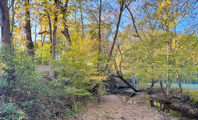 2025-10-24 - Adair County, KY - Photo by Linda Waggener, ColumbiaMagazine.com. The water is low in Big Clifty Creek due to the summer draught but still flowing and reflecting the autumn colors in the trees arching above.