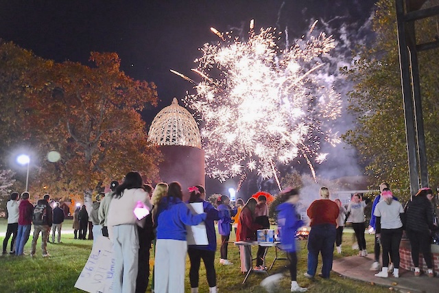 2025-10-24 - Columbia, KY - Photo courtesy Lindsey Wilson University. The Lindsey Wilson University Student Government Association hosted a Homecoming pep rally & fireworks display on the Campus Quadrangle to kick off our Homecoming festivities in style on Thursday, October 23, 2025.