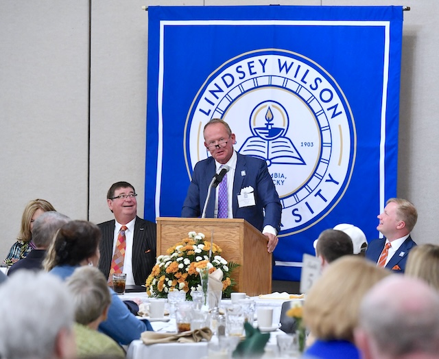 2025-10-25 - Columbia, KY - Photo courtesy Lindsey Wilson University. Adair County native Michael T. Neal '88 delivered the keynote address to a packed house at the Lindsey Wilson University Fall Trustee Appreciation and Endowed Scholarship Luncheon, held Friday, October 24, 2025, in the Roberta D. Cranmer Dining & Conference Center. At left is Lindsey Wilson President William T. Luckey Jr.