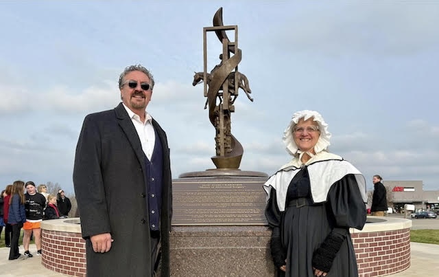 2025-12-15 - Green County, KY - Photo by Larry J. Smith, The Big Dawg, FM 99.9. Joel and Suzanne Bennett are pictured at the dedication of the Jane Todd Crawford statue in Greensburg last week. Suzanne plays Jane Todd Crawford and is dressed in clothing fitting the early 1800's era.