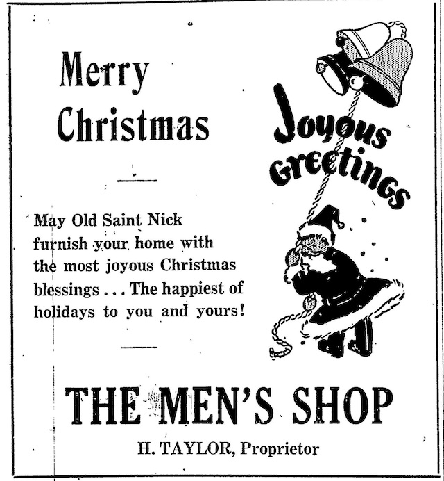Above, "Merry Christmas" wishes from The Men's Shop, H. Taylor, Proprietor.