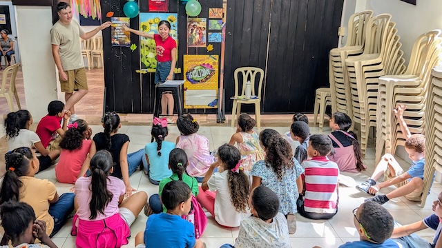 2025-07-09 - Santiago, Dominican Republic - Photo courtesy Lindsey Wilson University. Lindsey Wilson University students Braxton Crook of Lebanon, Tennessee, and Barbara Mendez of Liberty, Kentucky, teach a vacation Bible school class while on a mission trip to Santiago, Dominican Republic.