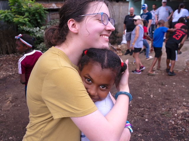2025-07-09 - Santiago, Dominican Republic - Photo courtesy Lindsey Wilson University. Lindsey Wilson University student Brianne Beck of Lebanon Junction, Kentucky, receives a hug from a student while serving on a mission trip to Santiago, Dominican Republic.